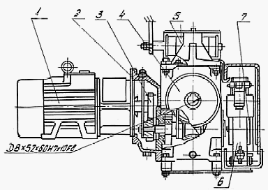 Привод ПК-6,3 состоит из приводного электродвигателя 1 соединенного с глобоидным редуктором переходным фланцем 2, в корпусе которого находится зубчатая передача З. Глобоидный редуктор 4 с межосевым расстоянием 125 мм состоит из червяка с двумя выходными концами и колеса со шлицевым отверстием в ступице. К верхним лапам корпуса редуктора прикреплен амортизатор 5, книжним - рама с установленным на ней тормозом. Тормозной шкив 7 смонтирован на выходном конце червяка. Крутящий момент от вала двигателя через зубчатую передачу 3 (шестерня установлена на валу двигателя, зубчатое колесо - на червяке) передается червяку, который вращает колесо редуктора, соединенное посредством шлицевого вала с ходовыми колесами крана. Торможение осуществляется прижатием колодок тормоза к шкиву. Тормозные колодки прижимаются к шкиву сразу же после отключения электродвигателя и остаются в таком положении вплоть до пуска привода. Амортизатор соединен с рамой ходовой тележки крана через упругий элемент, который сглаживает пиковые и ударные перегрузки, возникающие при пуске и торможении крана. Преимущество привода перед другими аналогичными механизмами заключается в его высокой нагрузочной и перегрузочной способности в сочетании с большим диапазоном передаточных чисел, компактностью и надежностью. В приводе использованы оригинальные конструкторско-технологические решения защищенные авторскими свидетельствами. Варианты исполненияУсловное обозначение привода состоит из обозначения его типа, передаточного числа, типа электродвигателя, климатического исполнения и категории размещения.